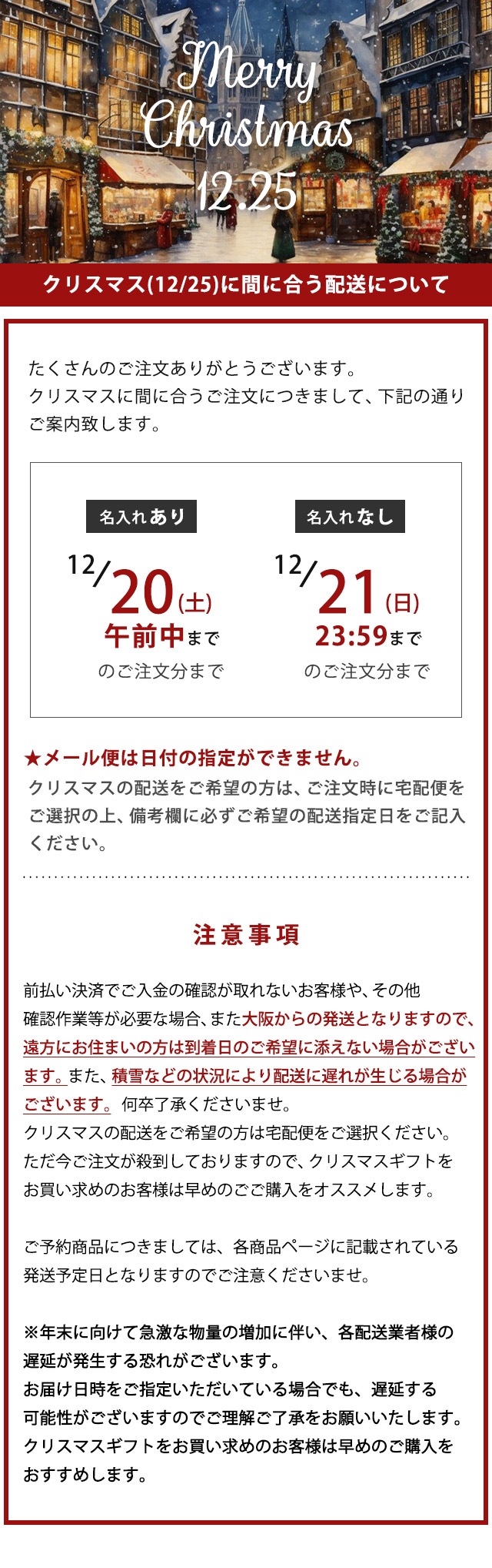 クリスマス12/25(木)に間に合う配送について