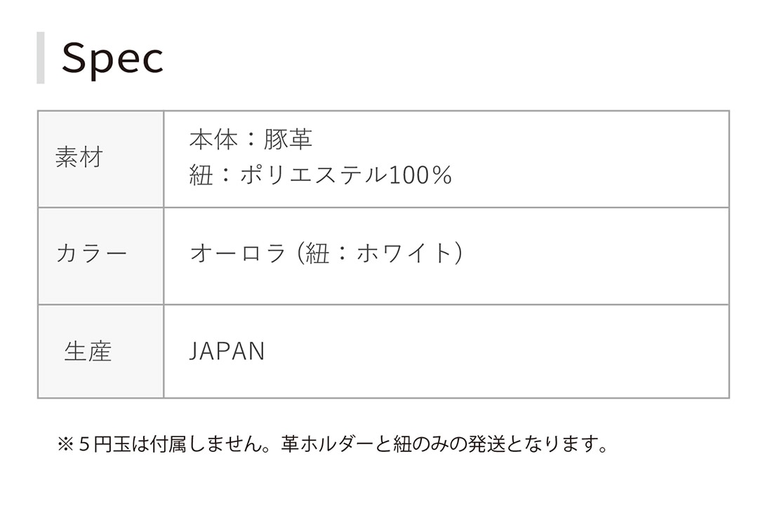 mūのaurora〈オーロラ〉シリーズから、キラキラ輝くご縁ホルダーが登場しました。 光の角度で虹色やパステル調に変化するフィルムが、見るたびに新しい印象を与えてくれます。 光の入り方や撮影環境によって表情が変わる、唯一無二の魅力。 人気の小型財布とお揃いで楽しむのはもちろん、特別なギフトとしてもおすすめです。 ※5円玉は付属しません。革ホルダーと紐のみの発送となります。